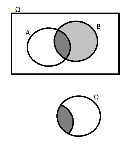 I like to think of conditional probability as "zooming in" to a smaller sample space: rather than thinking about all of \(\Omega\), we are thinking only about the subset of outcomes \(\omega\) where \(B\) happened. To find \(\mathbb{P}[A|B]\), we imagine that \(B\) is the entire sample space and consider the probability of \(A \cap B\) in that space.